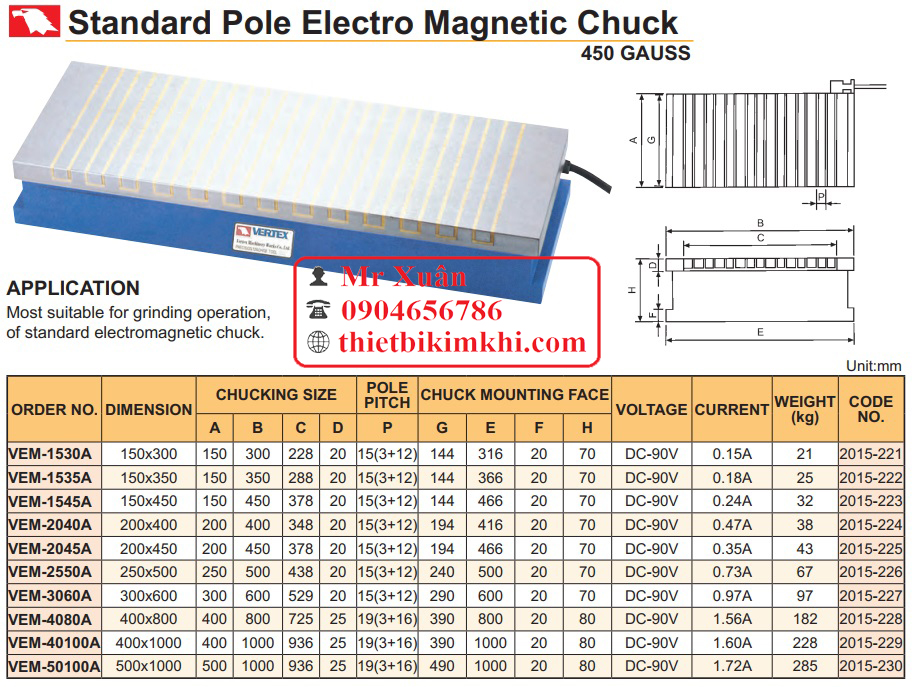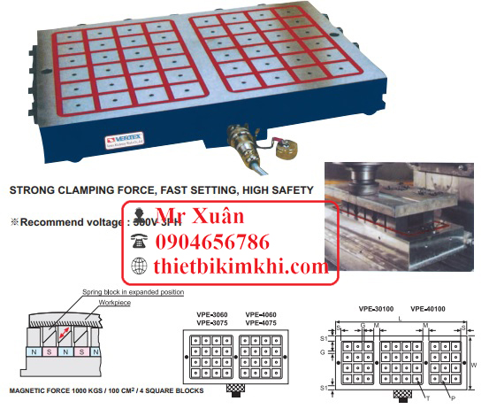 Bàn từ điên Đài Loan với lực từ 450 Gauss với các model VEM-1530A, VEM-1535A, VEM-1545A, VEM-2040A, VEM-2045A, VEM-2550A, VEM-3060A, VEM-4080A, VEM-40100A, VEM-50100A.