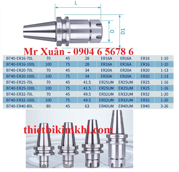Bầu kẹp dao phay BT50-ER40 sử dụng để kẹp dao phay, mũi khoan, mũi taro trên máy phay CNC Đài Loan, Nhật Bản,…