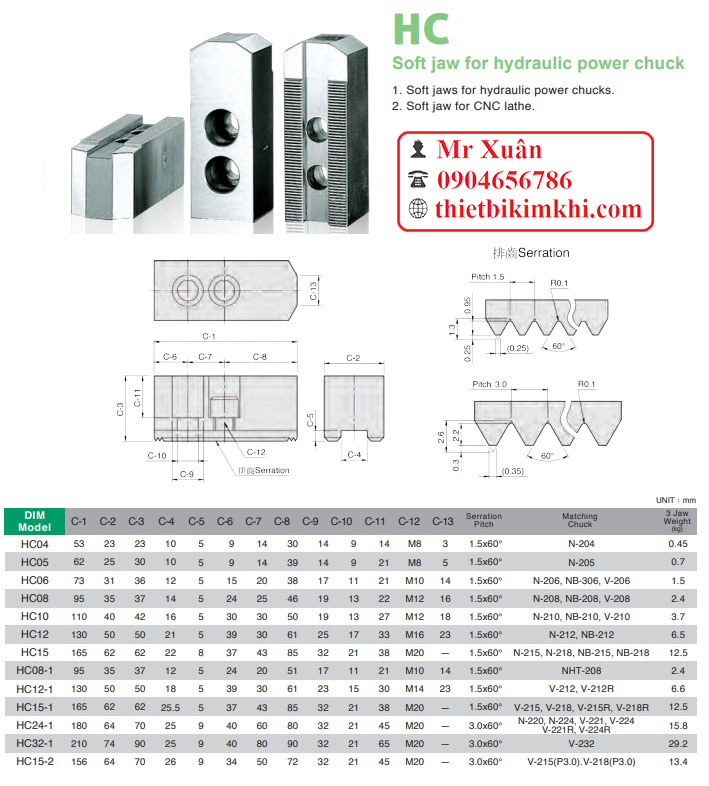 Như trên có chỉ rõ HJ05 với các kích thước trên phù hợp cho mâm cặp N-204, N-205, V-205 với mâm Auto Strong; phù hợp với mâm cặp 3H-204, 3H-205 với mâm cặp Auto Grip.