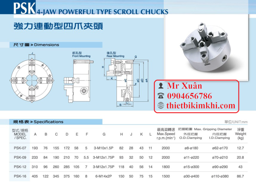 Gồm các model mâm cặp 4 chấu: PSK-07, PSK-09, PSK-12, PSK-16
