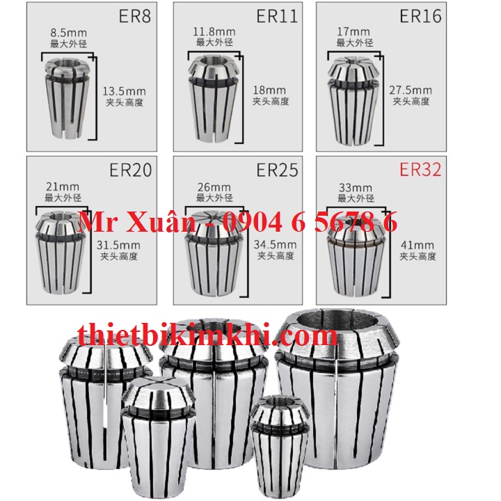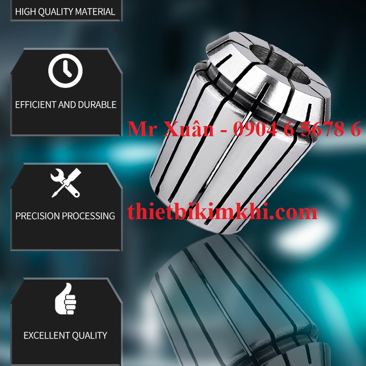 Vật liệu chế tạo là thép hợp kim 20CrMnTi với độ chính xác 0.008mm với các chủng loại collet ER16, ER20, ER25, ER32, ER40 được sử dụng rộng rãi trong các hoạt động phay, khoan, doa với các máy phay CNC, máy khắc, …