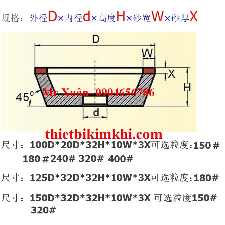 Đá mài hợp kim dạng bát kích thước đường kính ngoài x đường kính lỗ trong: 100x20mm và 125x32mm, 150x32mm với độ hạt các kích thước như #100, #150, #200, #240, #320, #400, #600, #800 tùy theo nhu cầu.