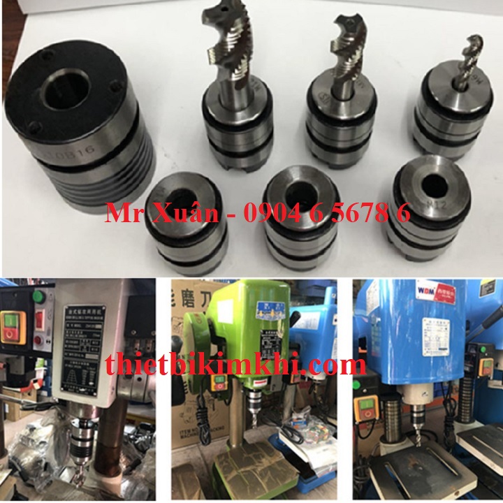 Khi sử dụng máy khoan bàn có chức năng khoan taro, để thực hiện chức năng khoan thì thường đã có bầu kẹp mũi khoan đi theo máy nhưng để thực hiện chức năng taro thì cần có bộ kẹp mũi taro chuyên dùng mới thực hiện taro được trên máy khoan bàn có chức năng khoan taro.