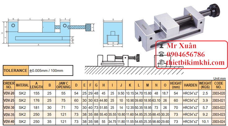 Ê tô VDV-20 chiều rộng má kẹp là 48mm và độ mở lớn nhất (khoảng kẹp) 55mm
