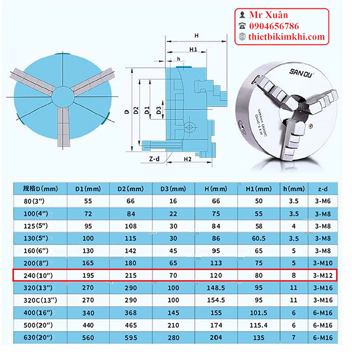 Thông số mâm kẹp 3 chấu 240mm K11-240