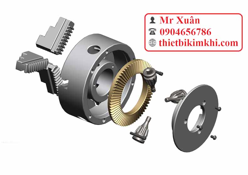 - Mâm cặp sau sẽ kết nối với máy tiện thông qua mặt bích được liên kết bởi mặt bậc và 3 vít
