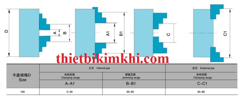 Với phạm vi kẹp được của mâm cặp bạn có thể xem các kích thước A-A1, B-B1 và C-C1 như hình bên dưới