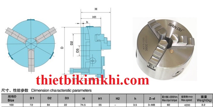 Mâm cặp 3 chấu đường kính 100mm model K11-100, đây là dòng mâm cặp 3 chấu kích thước nhỏ thường dùng trên các máy tiện nhỏ để kẹp các sản phẩm có đường kính nhỏ.