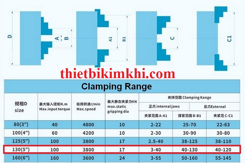 Với phạm vi kẹp được của mâm cặp bạn có thể xem các kích thước A-A1, B-B1 và C-C1 như hình bên dưới