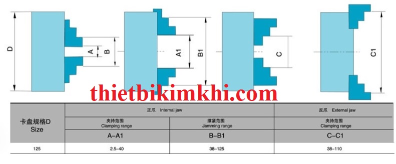 Với phạm vi kẹp được của mâm cặp bạn có thể xem các kích thước A-A1, B-B1 và C-C1 như hình bên dưới