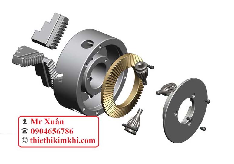 - Mâm cặp sau sẽ kết nối với máy tiện thông qua mặt bích được liên kết bởi mặt bậc và 3 vít
