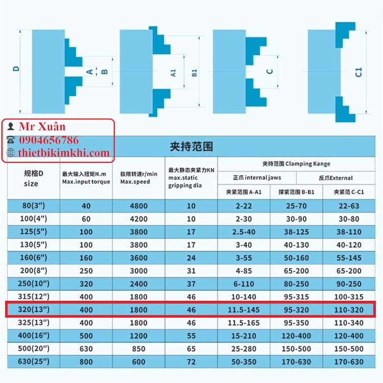 Với chấu kẹp thuận mâm cặp 320mm hay còn gọi là chấu kẹp phải