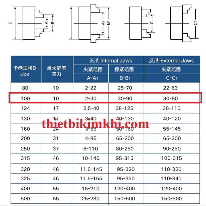 Với phạm vi kẹp được của mâm cặp bạn có thể xem các kích thước A-A1, B-B1 và C-C1 như hình bên dưới