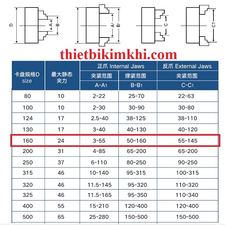 Với phạm vi kẹp được của mâm cặp bạn có thể xem các kích thước A-A1, B-B1 và C-C1 như hình bên dưới