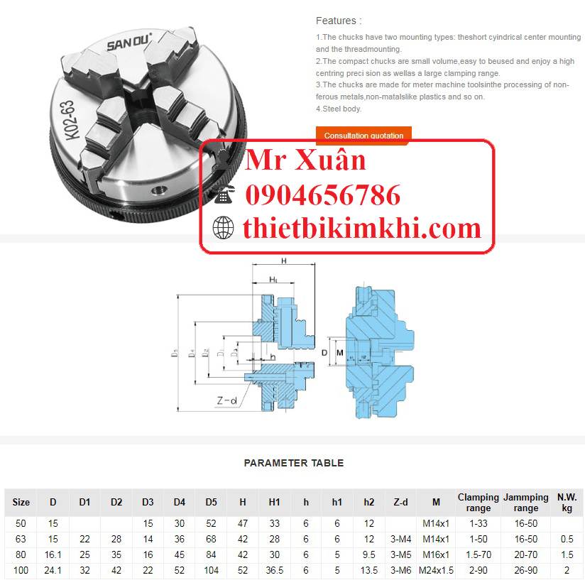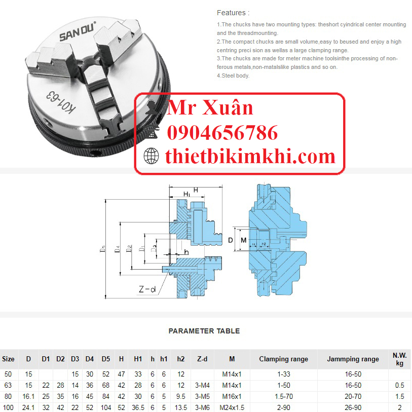 - Mâm cặp nhỏ gọn có khối lượng nhỏ, dễ sử dụng và có độ chính xác định tâm cao cũng như phạm vi kẹp lớn.