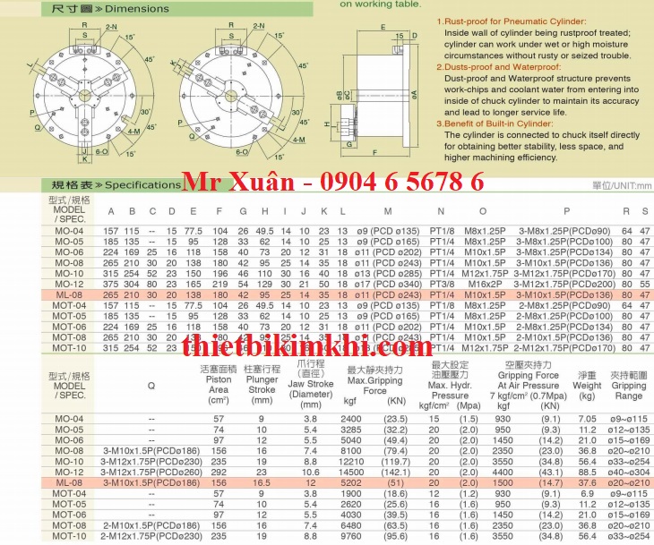 - Chống bụi và chống thấm: cấu trúc chống bụi và chống thấm ngăn chặn các phoi gia công và nước làm mát xâm nhập vào bên trong xi lanh mâm cặp để duy trì độ chính xác và kéo dài tuổi thọ.