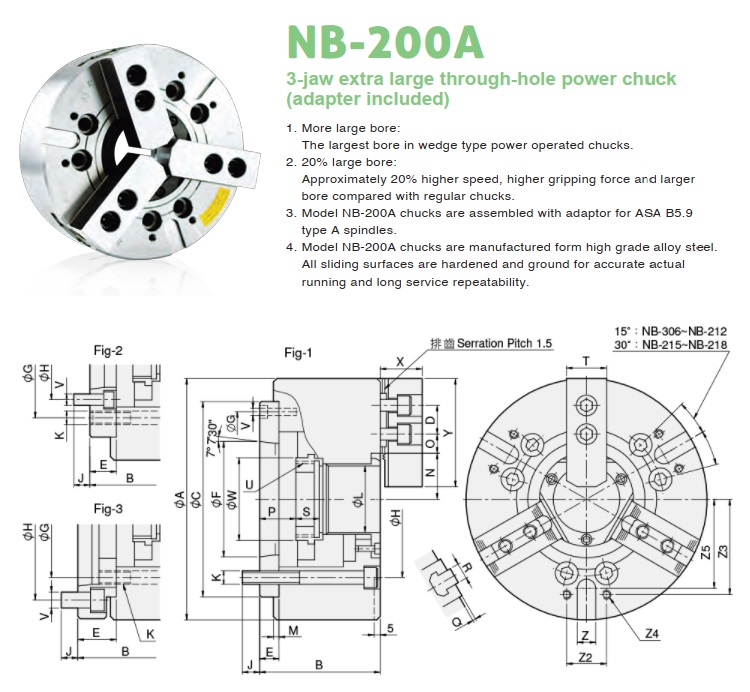 - Mâm cặp 3 chấu thủy lực lỗ trục chính lớn NB-200A