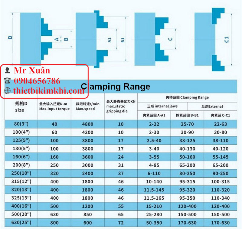 Bảng phạm vi kẹp của mâm cặp, trong đó: