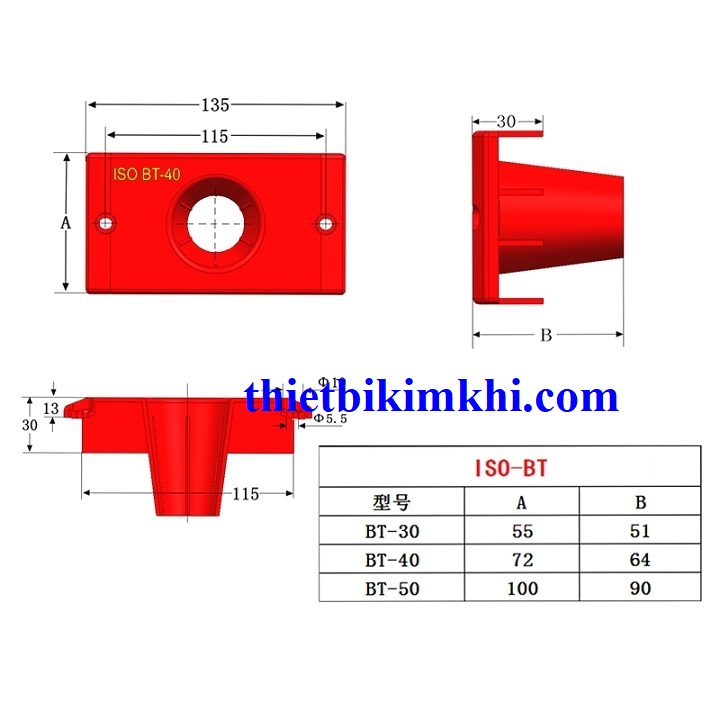 - Chiều dài 135mm (BT30, BT40 và BT50 chiều dài như nhau chỉ khác nhau về chiều ngang, chiều sâu do cấu tạo của lỗ cắm chuôi dao quyết định)
