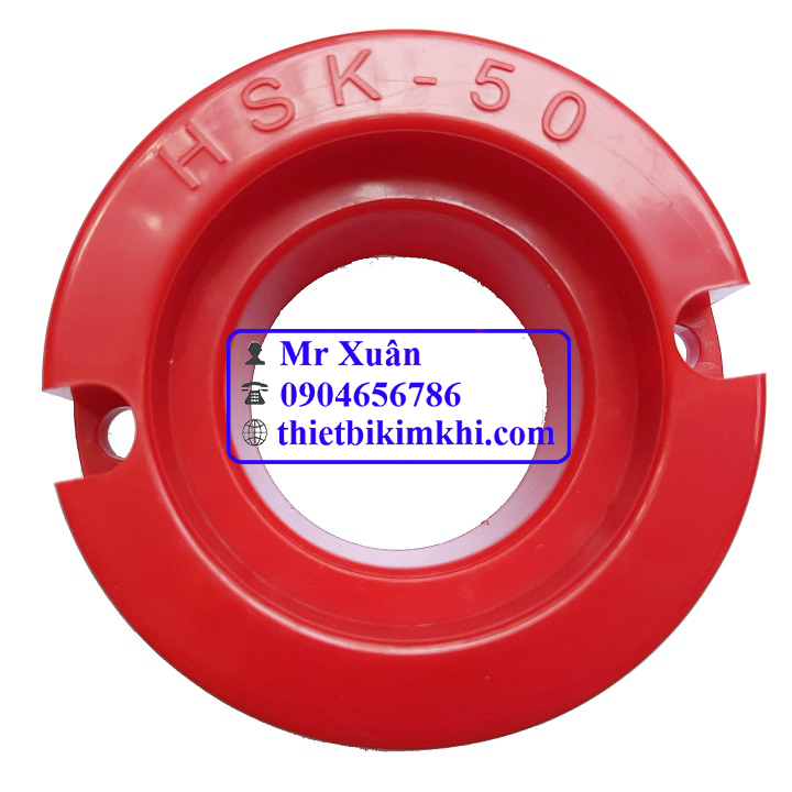 Mặt trước của khay cắm HSK bằng nhựa hình tròn là các vòng tròn với vành ngoài có 2 vị trí bắt ốc cố định vào bảng gá khay cắm sau này. Trên mặt vành có ký hiệu nổi HSK-50.