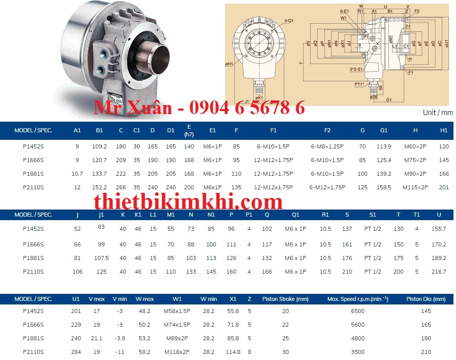 Xy lanh thủy lực trục rỗng lỗ to dạng mỏng P1452S, P1666S, P1881S, P2110S